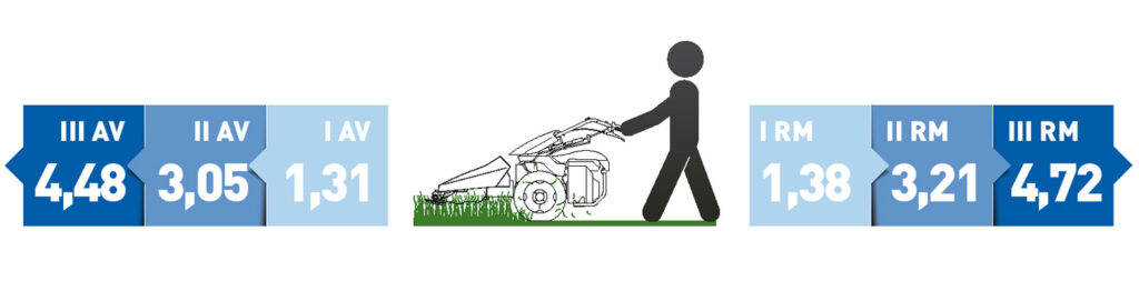 Zgornja slika prikazuje delovne hitrosti stroja v km/h (hitrosti naprej in hitrosti nazaj) s kolesi 5.0-10.