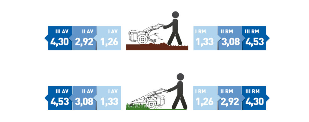 Zgornja slika prikazuje delovne hitrosti stroja v km/h (hitrosti naprej in hitrosti nazaj) s kolesi 4.0-10 v izvedbi stroja kot motokultivator, oz. kot kosilnica.